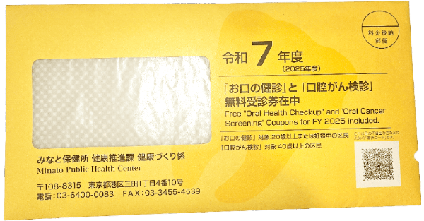 20歳・25歳・30歳以上の偶数年齢、前年度にお口の健診受診歴のある方は、こちらの黄色い封筒が自動的にご自宅に郵送されます。